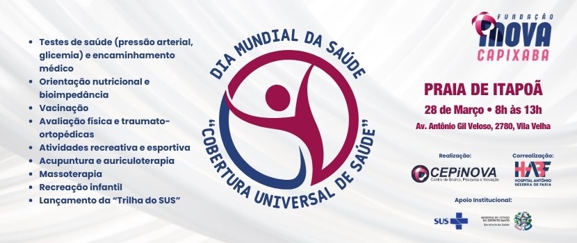 Em alusão ao Dia Mundial da Saúde, celebrado em 7 de abril, o Centro de Ensino, Pesquisa e Inovação da Fundação iNOVA Capixaba, em parceria com o Hospital Antônio Bezerra de Faria (HABF), promove uma ação na Praia de Itapoã, em Vila Velha, no próximo dia 28 de março, das 7h às 13h, levando serviços de saúde, orientação e atividades físicas à população em um ambiente aberto e acessível. A iniciativa pretende aproximar profissionais de saúde da comunidade e incentivar práticas de prevenção, qualidade de vida e cuidado com a saúde.